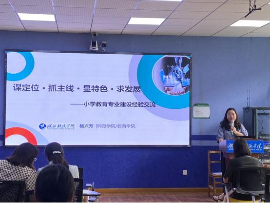 5月28日上午,小教联盟还举行了主题为“新文科背景下小学教育专业高质量发展”专业建设研讨会。会上各学校专家围绕小学教育专业特色、培养计划和教学改革等方面进行了深入而又富有成效的探讨,我院小学教育专业负责人杨兴芳老师做了“谋定位·抓主线·显特色·求发展——小学教育专业建设经验交流”的主题发言。