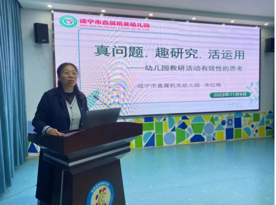 咸宁市直属机关幼儿园朱红梅园长进行了专题讲座《真问题,趣研究,活运用——幼儿园教研活动有效性的思考》。朱园长指出,我们应该建立园本教研制度体系,保障教研中解决“真问题”,要创新园本教研模式与方法,激发教师主动参与“趣研究”,针对教研活动中存在的问题,应调动教师教研积极性,应立足本园,分析问题,寻找问题突破口。趣教研,成就活教师;活教师,构建活课程。